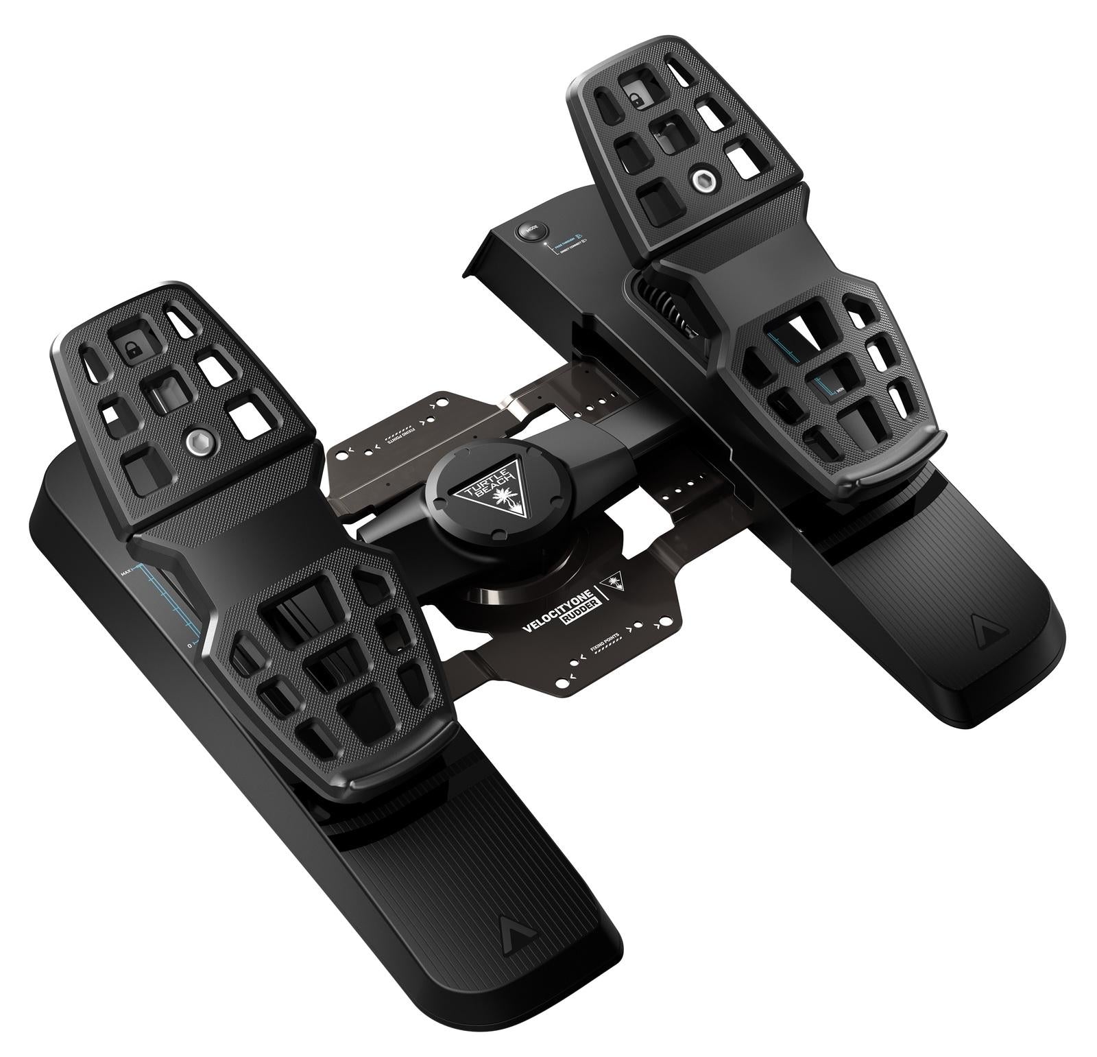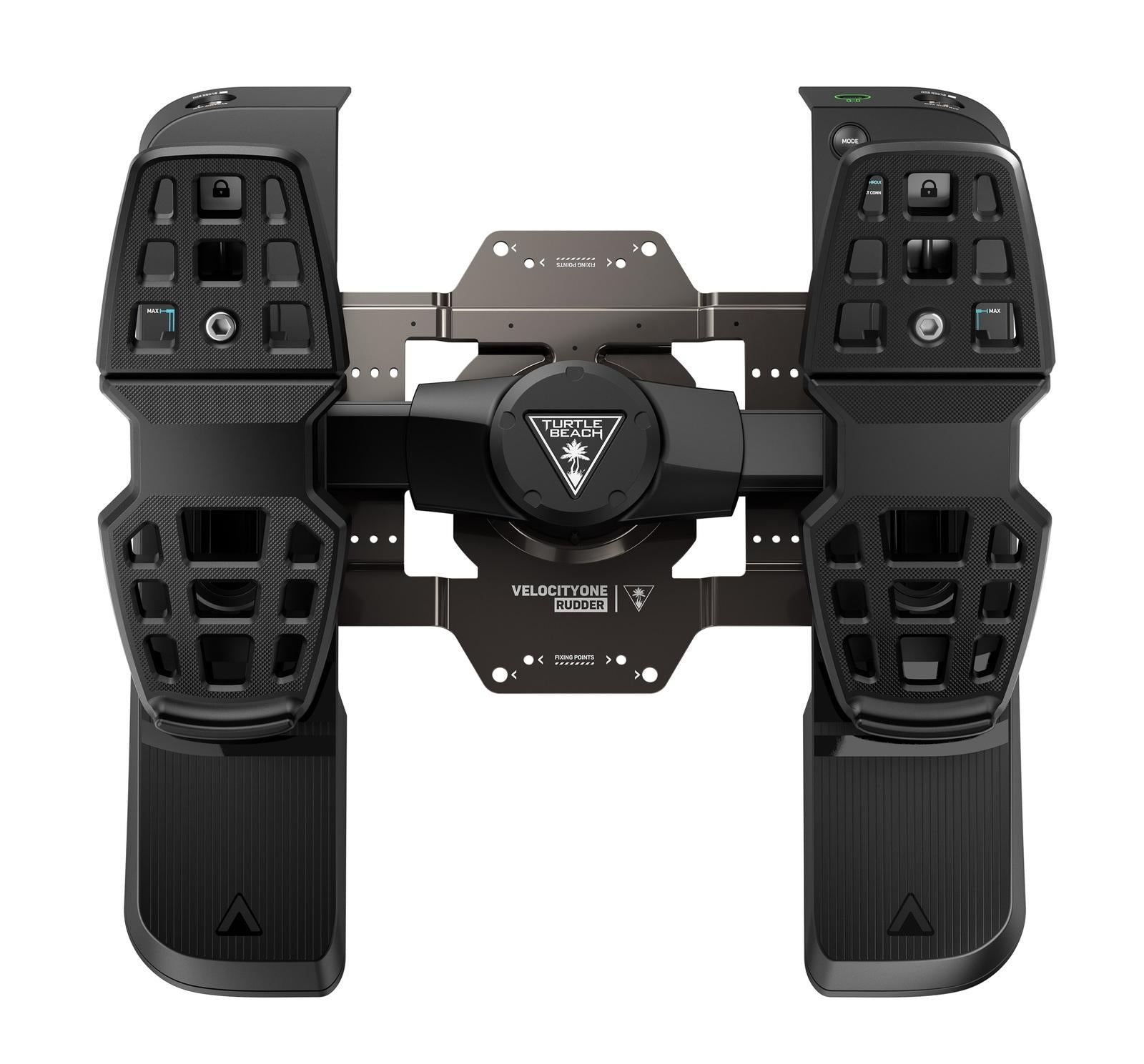 Take your flight simulation setup to an all-new level of realism with the Turtle Beach VelocityOne Rudder Pedals for Windows 10 & 11 PCs, Xbox Series X, Xbox Series S and Xbox One\*. Designed to pair perfectly with the VelocityOne Flight Universal Control System, or any existing yoke setup, the Rudder Pedals take your setup a step further for the ultimate in-flight experience. Entry level and experienced sim enthusiasts will appreciate the ultra-smooth rudder axis, providing fluid forward and backward movement for accurate directional control. Plus, with non-contact hall-effect sensors on all axes, you’ll have high-resolution 10-bit axis data, and longer product life with zero maintenance versus standard potentiometers.Adjustable differential brakes make for precise braking control and steering assist, with two sets of swappable springs on the main axis allowing you to further customize the perfect feel for different types of aircraft. Built to accommodate a wide range of users and aircraft types, the adjustable pedal width and two sets of swappable pedals add to the realism and offer even more adjustability. Keep the Rudder Pedals firmly planted on a variety of surfaces thanks to a stable, metal base and rubber pads with carpet spikes, or mount it permanently using the provided screws and pre-drilled holes. Play Microsoft Flight Simulator on Xbox Series X or Xbox Series S by connecting the Rudder Pedals to your VelocityOne Flight Universal Control System using the pass-through cable. Or flip the input switch to PC mode and connect the Rudder Pedals directly to your PC and cruise the skies on X Plane, Microsoft Flight Simulator and more.\*Only compatible with Xbox consoles when using the pass-through cable with the VelocityOne Flight Universal Control System.Features:* Ultra-Smooth Rudder Axis – A single, return-to-center axis provides fluid forward and backward movement for accurate directional control. Friction-free linear bearings allow for smooth, accurate and maintenance free operation. Two sets of swappable springs for the main rudder axis provide additional adjustability to set the perfect feel.* Differential Brakes – The spring-loaded brake pedals deliver precise runway braking control, or steering assist when pressing one pedal at a time.* Adjustable Pedal Width – Adjustable pedal width accommodates a wide range of users, and plane types. Plus, when not in use the adjustable footprint provides convenient storage.* Precise, Long-Lasting Axes – Non-contact hall-effect sensors on all axes deliver high-resolution, 10-bit axis data and longer product life over standard potentiometers.* Swappable Pedals – Two sets of pedals swap out easily and provide realistic replication from single engine prop planes to multi-jet airliners.* Stable Mounting Solutions – Sturdy metal construction with rubber pads and carpet spikes on the bottom provide a stable base on a wide range of surfaces and has pre-drilled holes for permanent mounting to existing home cockpits.* PC & Xbox Compatible – Plug the 2m USB-C to USB-A cable directly into your PC or press the mode switch and connect to your Xbox using the pass-through cable and the VelocityOne Flight Universal Control System.Connections:* USB-C to USB-A Connection: Windows 10/11* USB-C to USB-C Pass-Through Cable with VelocityOne Flight Universal Control System: Xbox Series X|S & Xbox OnePackage Contents:* VelocityOne Rudder* Interchangeable Pedals (4, 2 mounted on unit, 2 additional pedals)* Interchangeable Springs (4, 2 inside unit, 2 additional springs included)* M4 Screws (4)* Grip Pads (8)* 2m USB-A to USB-C Cable* 2.5m USB-C to USB-C Pass-Through Cable* Cable Binders (5)* Quick Start Guide* Quick Flight Guide* Allen KeyTechnical Specifications:* Software Compatibility: Microsoft Flight Simulator, other Flight Sim software with USB controller support* Input Connectivity PC: 2M USB-A to USB-C Cable to Xbox console or PC* Input Connectivity Xbox: 2.5M USB-C to USB-C Pass-Through Cable to VelocityOne Flight