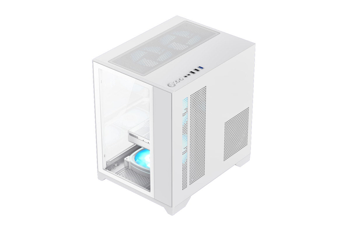 p{font-weight:bold;font-size:1.2em}. The GameMax Infinity Mini Gaming PC Case offers a compact design with efficient airflow, tempered glass panels and RGB lighting. Its space-saving layout supports high-performance components while ensuring easy cable management and a visually striking build.* *All-around cooling support.* Supports up to 7 × 120mm fans and 240mm liquid cooling.* *Tempered glass panels.* Two 3mm panels showcase RGB lighting and internal components.* *Cable management.* Removable storage box with HDD/SSD bays and routing holes.* *Expandable and compatible.* Supports Flex-ATX and Mini-ITX motherboards for compact, powerful builds.* *Right-side mesh panel.* Large integrated 1mm perforated mesh for airflow and dust prevention.* *Compact yet stylish.* Sleek design with black silk-printed edges and tempered glass for a premium look.* *Convenient I/O panel.* Includes 2 × USB 2.0, 1 × USB 3.0, HD audio, reset and power buttons.p{font-weight:bold;font-size:1.2em}. Premium tempered glass and ventilated mesh panelsThe front and side panels feature 3mm tempered glass with black silk-printed edges, combining strength and style. The right panel incorporates a large integrated mesh with 1mm perforations for improved airflow and dust protection.p{font-weight:bold;font-size:1.2em}. All-around cooling supportThe Infinity Mini Gaming PC Case can accommodate up to 7 × 120mm fans and a 240mm liquid cooler. This versatile cooling setup ensures optimal airflow and efficient heat dissipation, keeping high-performance components stable during intense gaming sessions.p{font-weight:bold;font-size:1.2em}. Expandable and compatibleThis mini-tower case supports both Flex-ATX and Mini-ITX motherboards, offering versatile compatibility for a range of compact builds. Its spacious interior allows for high-performance components, efficient cooling solutions and easy upgrades, making it ideal for powerful yet space-saving gaming setups.