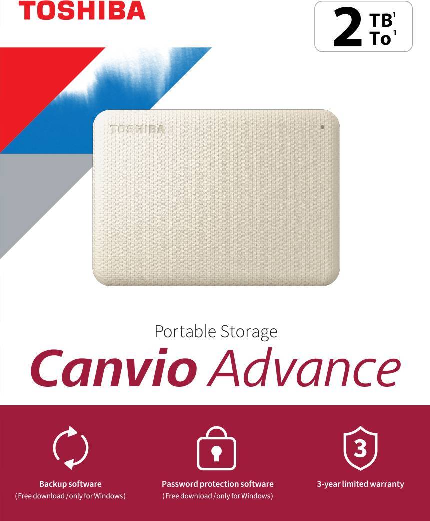 This Toshiba Canvio Advance External Hard Drive will help you store andbackup files, adding a peace of mind to your computing and giving you a copy ofdocuments you can take on the go. Your storage is protected by a password lockfeature and downloaded auto-backup software. The Canvio Advance V10 models aremade for SuperSpeed USB-C 3.0 transfers and are compatible with MacOS , as wellas, Windows.