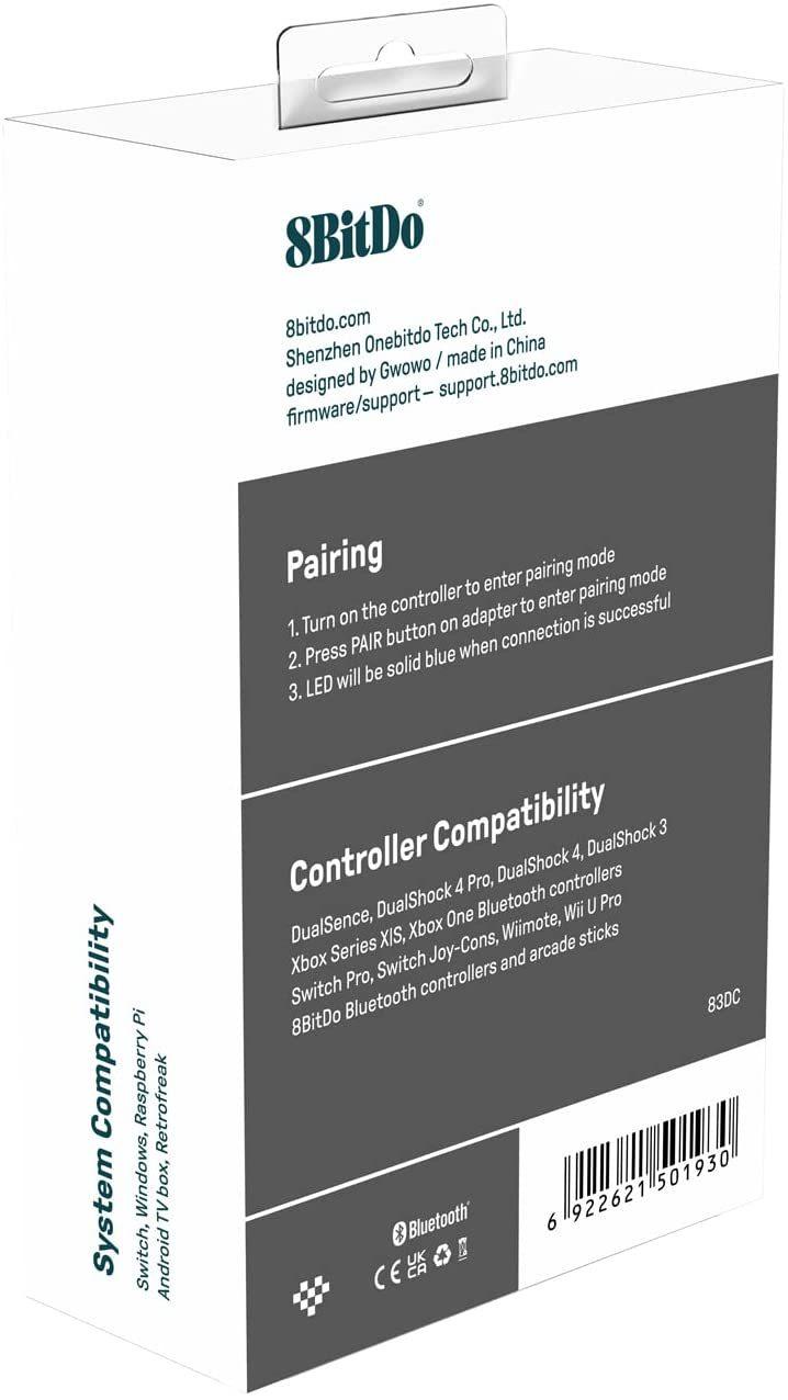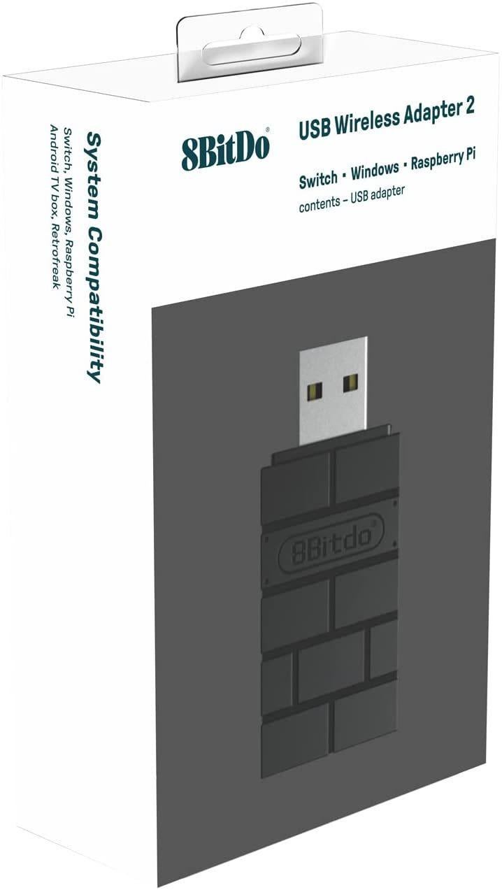 Play with your favorite controller using this 8BitDo wireless USB adapter. The versatile design and USB connectivity let you use a variety of wireless controllers to play games on Nintendo Switch, Windows PC, macOS, Raspberry Pis and more. Featuring advanced Bluetooth connectivity, this 8BitDo wireless USB adapter lets you play games without tangled cables and offers smooth, lag-free response. Compatible with 8BitDo Ultimate Software, it gives you elite control for PS5, PS4, Xbox One and Switch Pro controllers on Switch and Windows. Comes with customizeable button mapping, adjust stick & trigger sensitivity.Works with all 8BitDo Bluetooth controllers and arcade sticks, Xbox One Bluetooth controller,PS5 DualSense DualShock 3, DualShock 4, DualShock 4 Pro, Wii Remote, Wii U Pro, Switch Joy-Con, Switch Pro controllersFeatures:* Compatible with all 8BitDo Controllers, Xbox Series X | S, Xbox One Bluetooth controllers, PS5, PS4, PS3, Switch Pro, Switch Joy-con® controller, Wii Remote, Wii U Pro and more. ¹* Built-in Bluetooth : 2.1 Ensures lag-free gaming* Easy connection: Simply bind this adapter to your wireless controller to enable the same wireless experience you are used to on all the best platforms.* Allows for use with Nintendo Switch, Windows, and macOS PCs, Android TV box, Raspberry Pi, and Retrofreak* Vibration support on X-input mode* 6-axis motion on Switch* X-input, D-input, Mac mode, Switch mode* Upgradable firmware: Support 8BitDo Ultimate Software for PS5, PS4, Xbox One, and Switch pro controllers on Switch and WindowsSystem Compatibility:* Switch, Windows, macOS* Raspberry Pi, Android TV Box, RetrofreakConnectivity:* Bluetooth 4.0 ( Support Bluetooth LE ) ³1. Bluetooth controllers supported only.2. Ultimate software is compatible with Xbox Series X | S, Xbox One Bluetooth controllers, PS5, PS4 and Switch Pro only.3. The Bluetooth work mark and logos are registered trademarks owned by Bluetooth SIG, Inc.