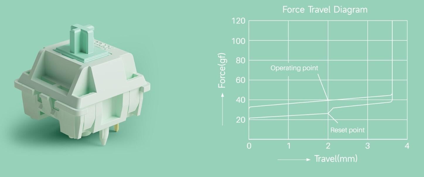 Akko Botany is a mid-pitched version of Rosewood with a clear bottom-out sound profile. The color of the switch is inspired by “Haworthia cooperi” in a light bluish green pattern.The switch features our custom Nylon (Pro) stem, a PA12 top cover, and a PA6 bottom housing, creating a unique material combination.* 5-pin and fits keycaps with standard MX structure.* Low Operating Force Linear Switch.* With a thin layer of factory lubrication.* Custom Nylon Pro stem, PA12 top, and PA6 bottom housing.* Clear bottom-out sound.*Technical Specifications:** *Type:* Linear* *Operating Force:* 38 ± 5gf* *Total Travel:* 3.6mm* *Pre-Travel:* 2.0 ± 0.6mm* *Tactile Travel:* N/A* *Tactile Force:* N/A