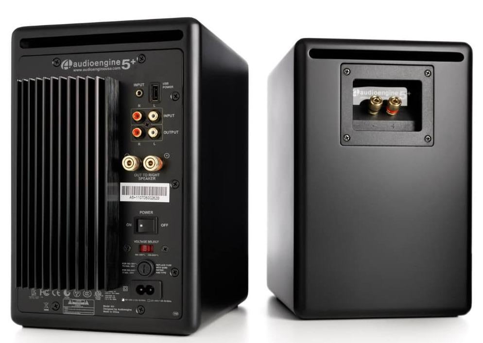 *Hear the Difference*The A5+ Powered Speakers are bookshelf speakers with sound that can fill any room. No network setup, passwords to enter, or buttons to push.You won’t hear any enhanced super-mega-hyper-monster boomy bass from these powered speakers. The low end from the A5+ Powered Speakers is real bass, very near to the originally-recorded music. From rap to classical to movies, you’ll get tight, punchy bass with an awesome growl that will make you smile – regardless of the volume level.Even if you’re not an audio enthusiast we guarantee your music will sound better!The A5+ Powered Speakers are bookshelf speakers that pack a big sound, filling any room. No network setup, passwords to enter, or buttons to push. Setting them up is so easy you’ll be rocking in no time.Clear, full and powerful audio that fills any room. The A5+ Powered Speakers are constructed with custom Audioengine components: aramid fiber woofers, silk tweeters, and built-in power amps wrapped in precision-tuned and hand-crafted cabinets.*Features:** 2-Speaker Stereo* Dual Analog Audio Inputs* Remote Control* Silk Tweeters & Aramid Fiber Woofers* Subwoofer Output ** Desktop or stands** 5” woofers** Analog inputs** Connect a subwoofer** Wireless options** Remote control*Specifics:** *Type* – Powered speaker system* *Amplifier Type* – Class AB* *Power Output* –150 W peak power total (50 W RMS / 75 W peak per channel), AES* *Drivers* – 5″ aramid fiber woofers, 0.75″ silk dome tweeters* *Input* – 3.5 mm stereo mini-jack, RCA L/R* *Outputs* – RCA variable line-out, USB (power/charge)* *Input Voltages* – 115/240 V, 50/60 Hz manually switchable* *SNR* – >95 dB (typical A-weighted)* *THD+N* – <0.05% at all power settings* *Crosstalk* – <50 dB* *Frequency Response* – 50 Hz-22 kHz ±1.5 dB* *Input Impedence* – 10K ohms unbalanced* *Idle* – 10 W* *Mute* – 6 W* *Sleep* – 4 W* *Connector Type* – Standard USB* *USB Device Class* – USB 1.1 or above* *Left (active)* – 10.75″ (27 cm) x 7″ (18 cm) x 9″ (23 cm)* *Right (passive)* – 10.75″ (27 cm) x 7″ (18 cm) x 7.75″ (20 cm)* *Left (active)* – 15.4 lb (7 kg)* *Right (passive)* - 9.6 lb (4.4 kg)* *Operating temperature* – 32 degrees F to 95 degrees F* *Non-operating temperature* – –4 degrees F to 113 degrees F* *Relative humidity* – 5 – 95% non-condensing