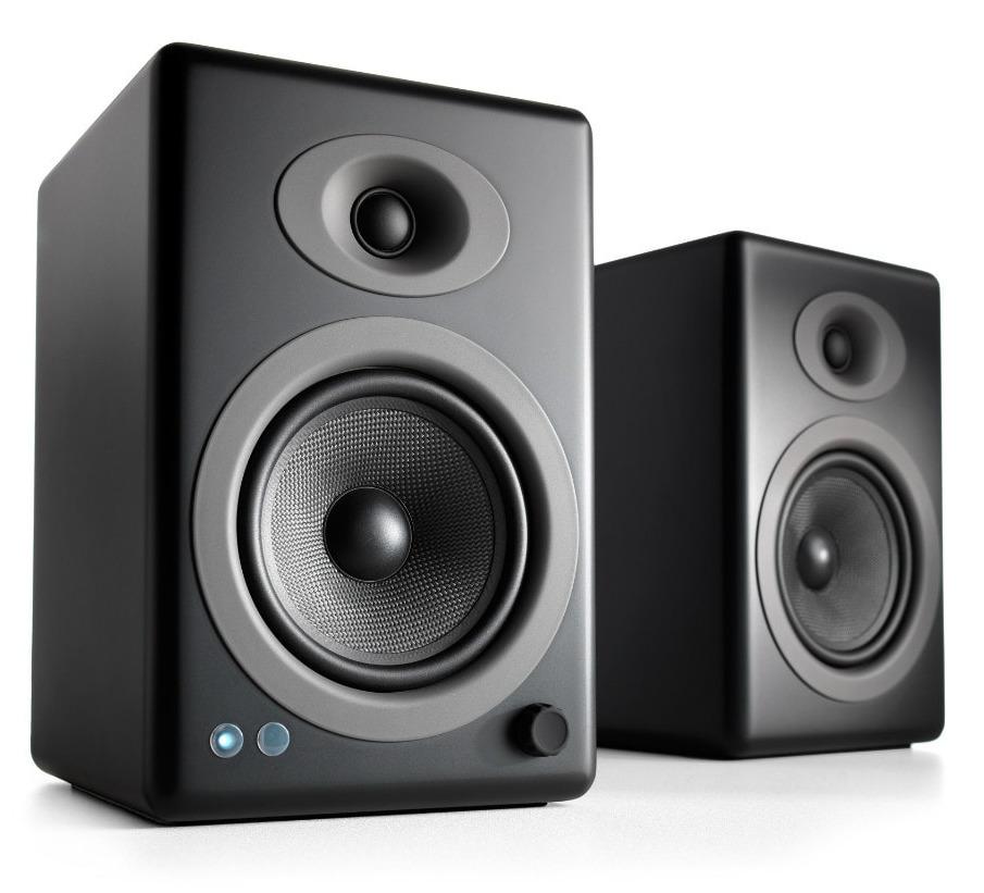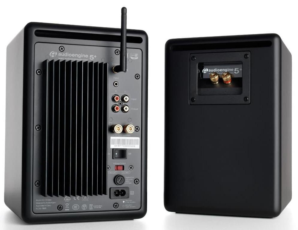 *Set up in seconds!*The A5+ premium powered speakers are a complete home music system with bold stereo sound that fills any room. It features wired or wireless connections including aptX-HD Bluetooth from your phone, tablet or computer, or good old analog from that turntable or prized tape deck.The A5+ Wireless Speakers are an exciting evolution changing the way people listen to music. A5+ Wireless isn’t just a pair of wireless speakers but a complete music system. With support for the aptX HD codec built in, get ready to enjoy high quality 24-bit audio, with all the convenience of a Bluetooth connection.The ultimate wireless music system that seamlessly works with all your apps, music, and devices. No matter how you listen, A5+ Wireless has you covered.Clear, full and powerful audio that fills any room. The A5+ Wireless Speakers are constructed with custom Audioengine components: aramid fiber woofers, silk tweeters, high-fidelity aptX-HD Bluetooth, and built-in power amps wrapped in precision tuned, hand-crafted cabinets. Perfect for any size space.*Features:** Small speakers with a big sound to fill any room* Custom aramid fiber woofers and silk tweeters* Extended-range wireless aptX-HD Bluetooth* Built-in power amps wrapped in hand-built wood cabinets* No network setup, no passwords, no hassle*Specifics:** *Type* – Powered Bluetooth aptX HD speaker system* *Amplifier Type* – Class AB* *Power Output* – 150 W peak power total (50 W RMS / 75 W peak per channel), AES* *Drivers* – 5″ aramid fiber woofers, 0.75″ silk dome tweeters* *Inputs* – 3.5 mm stereo mini-jack, RCA L/R, Bluetooth* *Outputs* – RCA variable line-out* *Input Voltages* – 115/240 V, 50/60 Hz manually switchable* *SNR* – >95 dB (typical A-weighted)* *THD+N* – <0.05% at all power settings* *Crosstalk* – <50 dB* *Frequency Response* – 50 Hz-22 kHz ±1.5 dB* *Input Impedence* – 10K ohms unbalanced* *Idle* – 10 W* *Mute* – 6 W* *Sleep* – 4 W* *Internal D/A Converter* – AKM AK4396* *Input Bit Depth* – 24 bit (padded)* *Bluetooth Receiver Type* – Bluetooth 5.0* *Supported Codecs* – aptX HD, aptX, AAC, SBC* *Wireless Operation Range* – Up to 100 ft (30 m) typical* *Input Data Rate* – Determined by Bluetooth* *Wireless Latency* – ~30 milliseconds (ms)* *Operating temperature* – 32 degrees F to 95 degrees F* *Non-operating temperature* – –4 degrees F to 113 degrees F* *Relative humidity* – 5% to 95% non-condensing