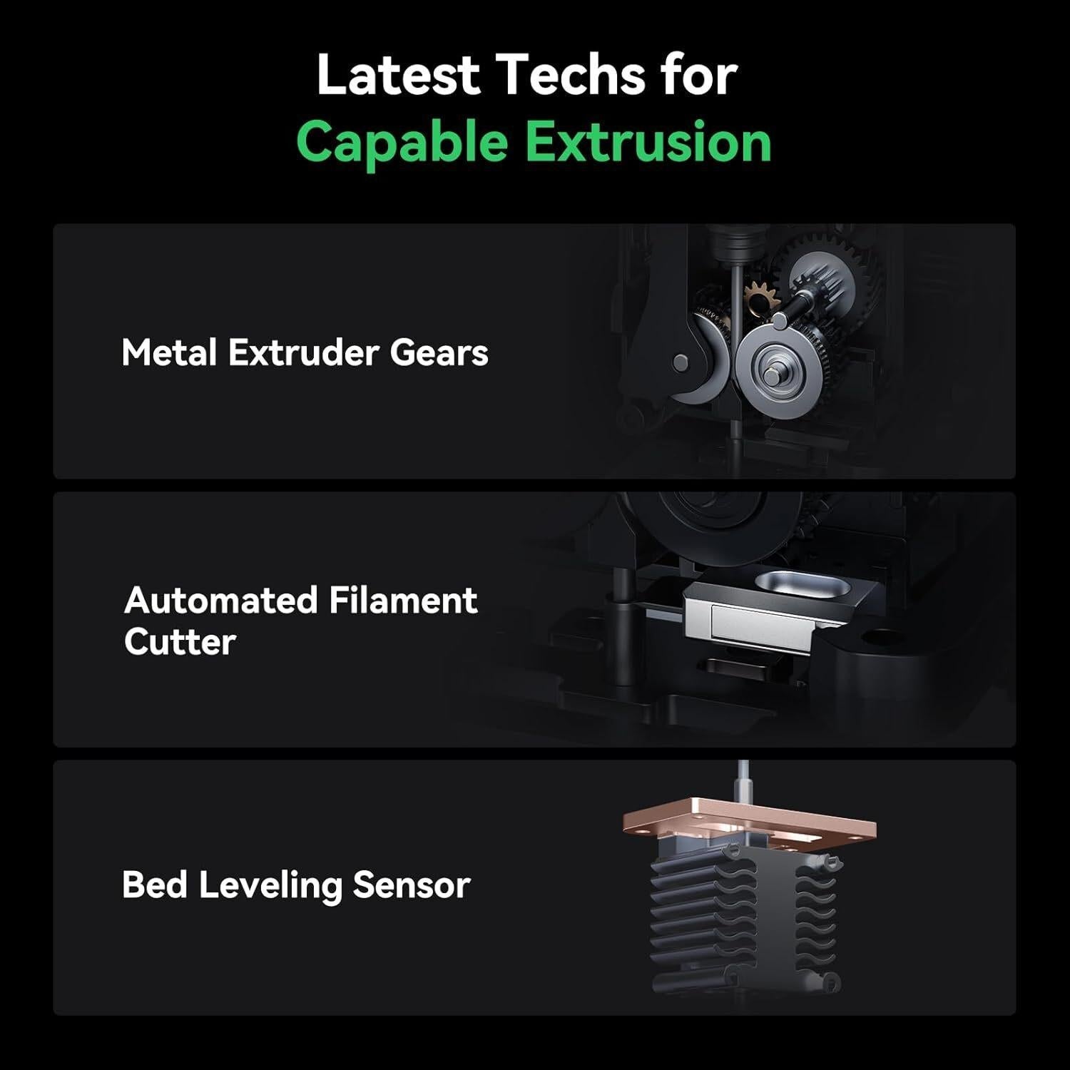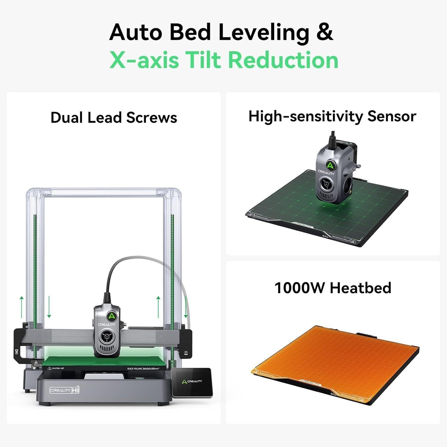Please Note: Creality Hi Combo includes only one CFS unit. For 16 colors, you need to buy three additional CFS units.---*_A Wonderful Choice for Multicolor 3D Printing_** Color-boost Your Creative ProjectsCFS comes with a connection hub on the back. By hooking up as many as four CFS units together, you are able to print in the splendor of 16 colors\*. Saves the need for extra painting afterward.* Built-in Sensor to Read Filament InfoJust scan a Creality RFID filament on the right side of the printer base, and the built-in sensor will automatically identify its color and type. It will remind you when there is a conflict between the slicing info and the actual filament in use.* Auto Bed Leveling & X-axis Tilt ReductionA good first layer is a nice print half done. Creality Hi, with a comprehensive and precise auto-leveling system, grants you the perfect first layer every time.* Smooth Filament In/Out by Touch ControlFilament load & unload now gets even easier with the CFS in play. Simply insert the filamentinto the feeding tube, and then give a few quick touches.* Distinct Sounds to Keep You InformedThe built-in buzzer will give off corresponding sounds when the print task is finishedor paused unexpectedly. No need for your constant attention.* Camera with a Privacy Cap· Video monitoring of your print jobs· One tap to share time-lapse video· Camera cap for privacy protection* A Much Quieter ExperienceThe operating noise has been tempered by the dynamically balanced fans, the frictionless linear rail, and the smooth linear rods. So you get more tranquility.* As Steady as It Is StylishCreality Hi features an all-metal body with unibody parts die-cast out of aluminum alloy.It looks stylish and ensures minimal shaking. The printer also gets a linear rail on the X-axisand two linear rods on the Y-axis. The rigid structure and smooth motion will elevate the print quality considerably.* Clean Support Removal for Intricate ModelsCFS makes post-processing much easier—by creating the support structures in a different material that can be snapped away or even water-soluble. The resulting 3D model will not show any support marks.* Boosted by FOC Step-servo MotorsThe X and Y-axis of Creality Hi are driven by step-servo motors with FOC algorithms.Minimal step loss and layer shift. It enables quiet and smooth motion even at a mind-blowing print speed.500 mm/s\*Max Speed12000 mm/s²\*Max Acceleration* Creality OS Profoundly EvolvedThe latest Creality OS will unlock the full power of your 3D printer. It features smart multi-filament management and allows for fine-tuning in expert mode or with root access. FLUIDD WebUI is also supported for your convenience.*Main Features:** Intelligent CFS: CFSx4 for up to 16 colors; Enabling snap-away supports.* Hands-off Calibrations: Automatic filament reading, leveling, and PA tuning.* Easy to Start: 95% pre-assembled; Thoughtful boot-up guide.* All-metal Body: Die-cast parts made of aluminum alloy, rigid and stylish.* Fast Print Speed: Max. Speed 500 mm/s Max. Acceleration: 12000 mm/s²* Feature-packed Extruder Integrated design, easy to maintain and clog-free.*Specifications:** Build Volume:260×260×300 mm* Frame: Aluminum Alloy* Printing Speed: 300 mm/s typical speed; 500 mm/s max speed* Acceleration:≤12000 mm/s²* 3D Printer Dimensions: 409 × 392 × 477 mm* Printer Package Dimensions: 650 × 460 × 240 mm* Combo Package Dimensions: 650 × 460 × 560 m* 3D Printer Net Weight: 8.75 kg* Combo Net Weight:13.31 kg* 3D Printer Gross Weight:11.58 kg* Combo Gross Weight: 19.14 kg* Build Plate: Two-sided epoxy flexible build plate* Heatbed Temperature: ≤ 100 ℃* Part Cooling Fan: Closed-loop Control* Hotend Fan: Closed-loop Control* Extruder Direct : drive extruder* Hotend: All-metal & integrated* Extruder Gears: Steel* Nozzle: Durable tri-metal nozzle* Nozzle Temperature: ≤300℃* Nozzle Diameter (Default): 0.4 mm* Nozzle Diameter (Optional): 0.6 mm、0.8 mm* Filament Cutter: Built-in* Filament Diameter: 1.75 mm* Monitoring Camera : Yes* Filament Run-out Sensor: Yes* Filament Tangle Detection: Yes* Auto Filament Relay: Yes (with CFS)* Supported Filaments: Hyper-PLA/PLA/PETG/ABS/PLA-CF* Display Screen: 3.2" color touch screen (320×240px)* File Transfer: USB drive/WiFi* File Storage: 8GB* User Interfaces: Touch screen, Creality Cloud App, PC program* MCU: Dual-core ARM Cortex-A7 microprocessor* Slicing Software: Creality Print 5.1 and newer versions* Supported Languages: English, German, Spanish, French, Italian, Portuguese, Turkish, Russian, Japanese, Chinese* Leveling Method: Leveling with strain gauge* XYZE Motor: Step-servo motor for X/Y axis; step motor for others* Input Shaping (G-Sensor): Yes* Lighting Kit: Yes* CFS Connection: ≤ 4 (Separate power source required for 2 and more units)