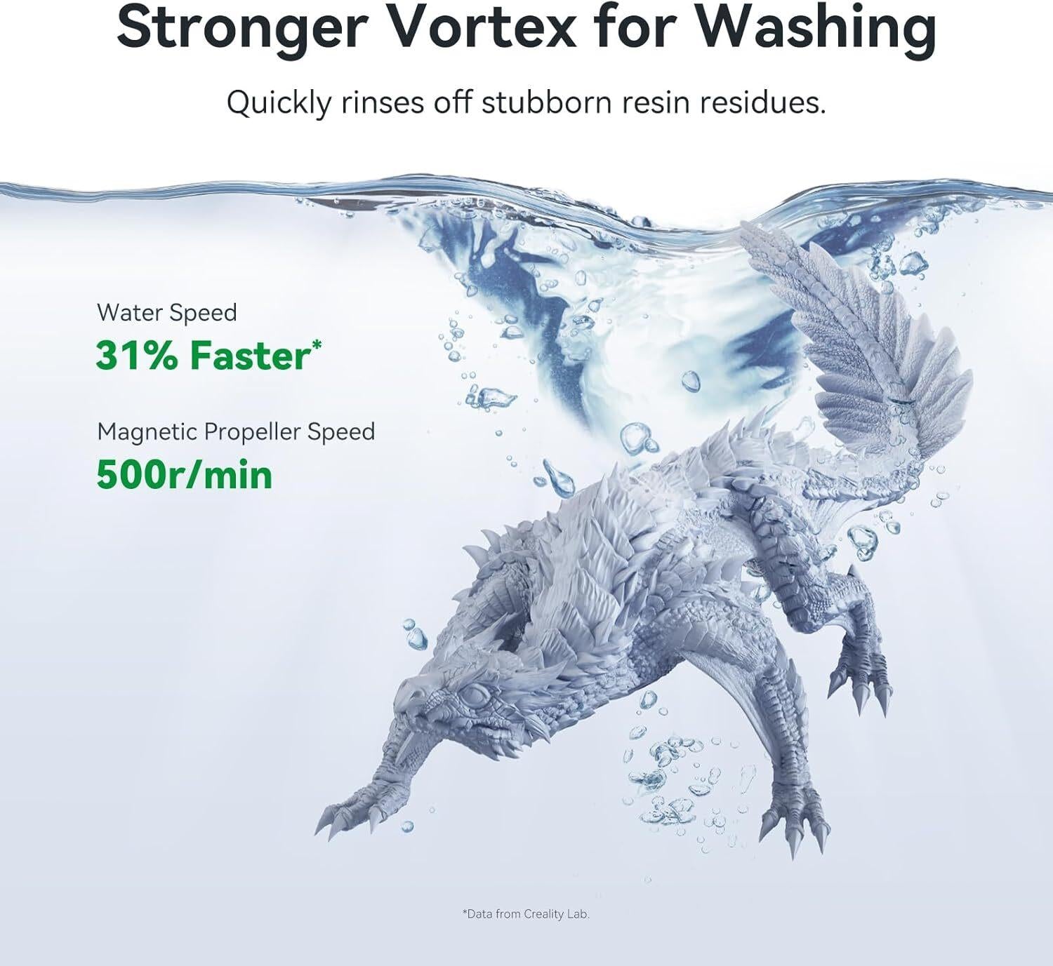 *_Creality Wash and Cure Station UW-03 2 in 1 Machine Resin 3D Printer_** *Powerful Vortex & 405nm UV Light*Wash and cure, two in one. It brags a 31% stronger washing solvent vortex powered by a 500r/min magnetic propeller, easy to rinse off stubborn resin residues in every nook and cranny of miniatures. When it comes to curing, the enhanced array of 405nm UV LEDs gives off a more effective UV light. As the turntable rotates, the model surface gets solidified quickly and evenly. After washing and curing, your resin prints become neat, strong, and durable* *Large Wash & Cure Volume*The wash volume is as large as 6.72L (210×160×200mm), able to accommodate prints of almost any size produced by consumer resin printers. Besides, with the light bar relocated, the machine is fitted in with a bigger turntable, and the cure volume is increased to 10.64L (215_165_300mm), which is 13.7% larger than UW-02. So, you can process larger and more models for a single curing session* *Anti-roll Square Turntable*A square turntable is adopted for the first time. It is more space-efficient, given most resin prints occupy a square space rather than a round space. Moreover, the turntable features a perimeter curb, which is effective in keeping 3D models from rolling. And, it is stabilized by four ball casters at the bottom. The curing process is more steady than ever before* *More Ways of Wash & Cure*Besides the regular methods of in-basket washing and on-turntable cure, it also enables hang-state wash and basket cure. For hang-state wash, you can wash resin prints attached to a build plate ranging from 8.9in to 10.3in, without removing the drippy resin prints beforehand. For basket cure, you can place the basket filled with oddly shaped models on the turntable for curing. No more fiddling with their orientations* *Triple Precautions for Safety*The orange-tinted lid can block 99.9% of UV light from harming the eyes. The curing process will stop if the UV-blocking lid is not in place. So you can stay clear of potential hazards from the working UV light or turntable. In addition, the washing container is completely sealed. No more leakage, spilling, or volatilization of liquid during the washing process*Highlights** A Mighty Vortex Cleans AllUW-03 features a powerful magnetic propeller to stir up a mighty vortex of water/alcohol. It can rinse off stubborn resin residues in every nook and cranny of miniatures or figurines.* Large Wash & Cure VolumeUW-03 is smaller but equipped with a bigger square turntable which can carry larger and more models for a single curing station.* Intense 360° UV ExposureAn enhanced array of 405nm UV LEDs brings about an intense UV exposure. As the turntable rotates, the model surface gets solidified quickly and evenly. So, your prints can become strong and durable.* Anti-roll Square Curing TurntableUW-03 wash and cure station is equipped with anti-roll square curing turntable, which is effective to keep 3D models from rolling and the 4 ball casters are additional weight-bearing points to stabilize the turntable.*Specifications** Product Dimensions: 325_303_436mm* Package Dimensions: 378_346_507mm* Net Weight: 5.4kg* Gross Weight: 7.5kg* Wash Volume: 210_160_200mm (6.72L)* Cure Volume: 215_165_300mm (10.64L)* UV Wavelength: 405nm* UV LED:18 UV LEDs* Timer Setting: 5–30min* Speed Modes: Fast/Normal* Control Mode: Physical Buttons* Enclosure: Fully Enclosed* Container Material: PP* Basket Material: Stainless Steel* Input Voltage: 100V-240V* Output Voltage: DC 24V* Rated Power: 60W 80N