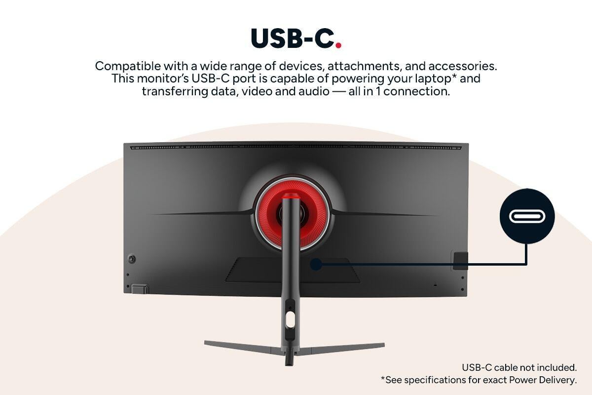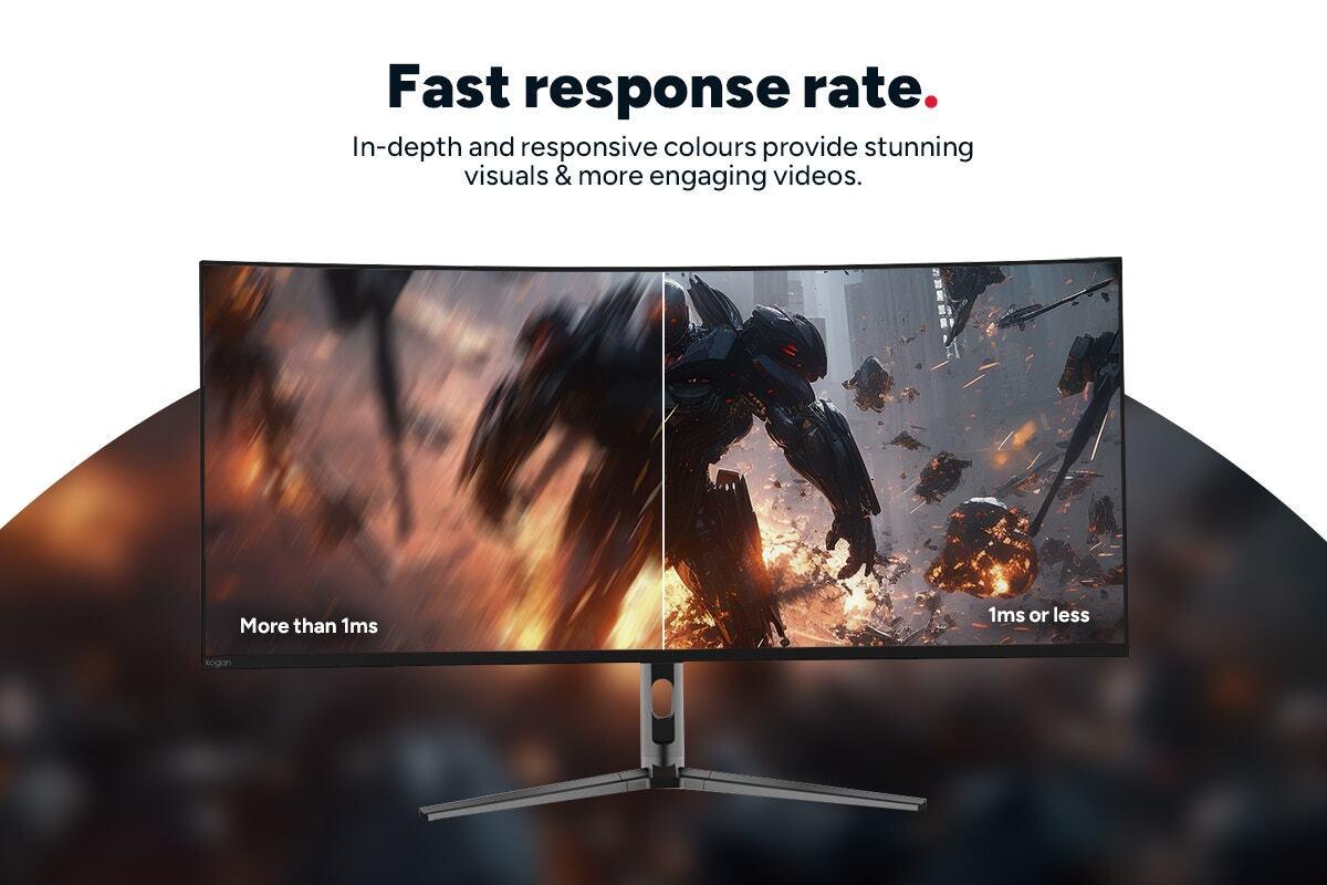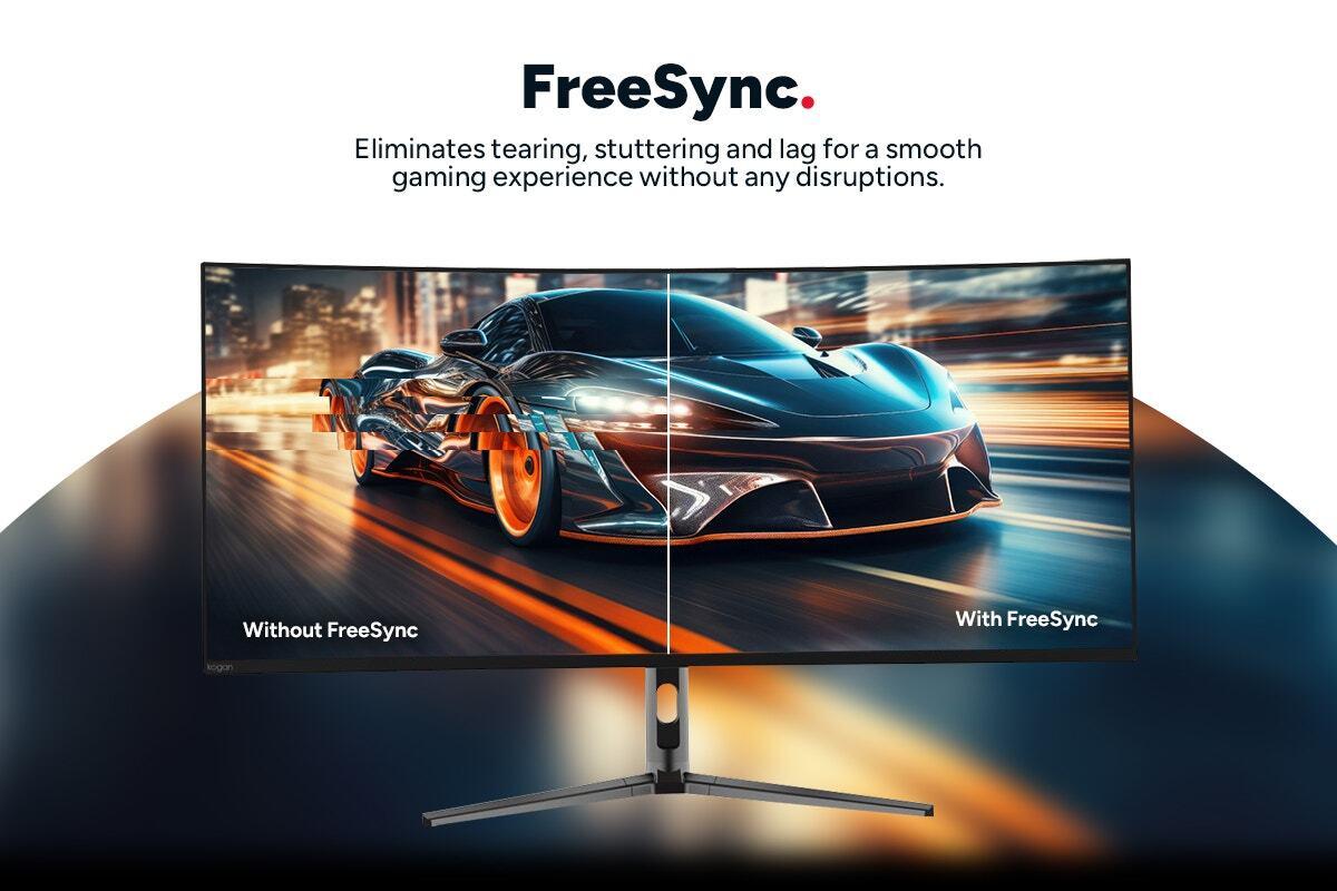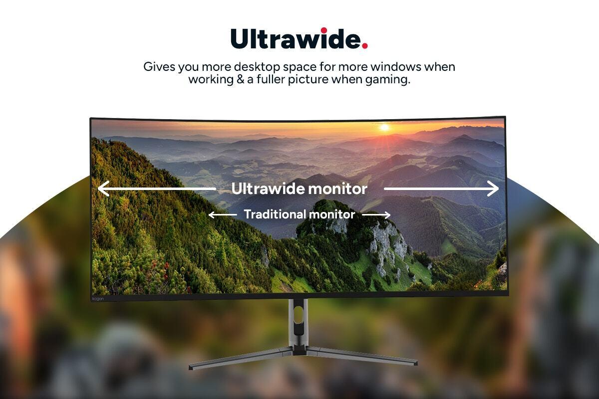 The Kogan™ Infinity 38" Curved Ultrawide WQHD+ Gaming Monitor delivers stunning visuals, fluid motion, and enhanced performance with its expansive 38" curved display, 144Hz refresh rate, and FreeSync technology, perfect for gaming and multitasking.* _38" ultrawide display._ Expansive 3840 × 1600 resolution for immersive visuals.* _144Hz refresh rate._ Smooth and fluid gameplay for fast-paced action.* _FreeSync technology._ Reduces screen tearing for seamless gaming performance.* _2300R curved design._ Surrounds you for a more immersive viewing experience.* _USB-C connectivity._ Streamline your setup with a single connection for data, video, and power.* _Mechanical adjustability._ Adjust height, tilt, swivel, and pivot for optimal viewing comfort.* _IPS panel._ Delivers accurate colours and wide viewing angles for a vibrant display. Expansive ultrawide displayThe Kogan Infinity 38" Curved Ultrawide monitor offers an impressive 38" screen with a 3840 × 1600 resolution, providing an ultra-wide field of view perfect for gaming, multitasking, or creative projects. Its wide 21:9 aspect ratio gives you more screen real estate, enhancing your productivity and fully immersing you in games or movies.Smooth and responsive gameplayWith a 144Hz refresh rate, this monitor ensures butter-smooth transitions and reduced motion blur during fast-paced games. Whether you’re racing through dynamic battle scenes or navigating detailed worlds, you’ll enjoy a seamless gaming experience that keeps up with every action.FreeSync for seamless performanceSay goodbye to screen tearing and stuttering. The built-in FreeSync technology ensures a smooth, responsive experience by synchronising the monitor’s refresh rate with your gaming device’s frame rate, delivering a flawless, lag-free gaming experience.Curved design for total immersionThe 2300R curved screen surrounds your vision, bringing every detail to life with an immersive wraparound view. This gentle curve enhances depth perception and creates a cinematic experience, making your gaming sessions and multimedia content more engaging.USB-C for simplified connectivityThe Kogan Infinity monitor features a USB-C connection with 65W power delivery, enabling you to transfer data, stream video, and charge your devices simultaneously—all through a single cable. Enjoy a streamlined, clutter-free workspace with effortless connectivity and fast, reliable power for your laptop or devices.Customisable viewing comfortAchieve the perfect viewing angle with full mechanical adjustability. This monitor offers tilt, swivel, pivot, and height adjustments to suit your preferences and maintain ergonomic comfort during long gaming or work sessions. Whether for work or play, you can adjust the screen for maximum comfort and productivity.~Please note: Due to the subdivision of HDMI certification standards, HDMI 2.1 is divided into TMDS (the bandwidth is equivalent to the original HDMI 2.0 and FRL protocols). The HDMI 2.1 interface of this product supports the TMDS protocol, the maximum supported resolution is 3840 \* 1600, and the maximum refresh rate is 85Hz.~*Technical Specifications*Audio* Audio Output: Yes* Impedance: 8Ω* Speakers: 3WDimensions* VESA Wall Mount Pattern: 100 × 100mm* Weight: 6.7kg* With Stand: 897 × 270 × 529mm* Without Stand: 897 × 86.6 × 391­.5mmDisplay* Actual Contrast Ratio: 1000:1(ANSI)* Backlight: E-LED* Brightness: 300cd/m²* Colour Depth: 8 bits* Curvature: 2300R* Monitor Colour Gamut: NTSC 95% | sRGB 100%* Monitor Resolution: WQHD+* Monitor Size: 38"* Monitor Size: 38"* Native Aspect Ratio: 21:9* Panel Type: IPS* Pixel/Dot Pitch: 0.22908mm (H) x 0.22908mm (V)* Refresh Rate: 144Hz* Resolution: 3840 × 1600* Response Time: GTG: 5ms | OD: 1ms* Type: Curved Ultrawide Display* Viewing Angle: 178° (V) / 178° (H)Features* Colour: Black* Flicker-free: Yes* Freesync Range: 60–144Hz* Low Blue Light: Yes* Over Drive: Yes* PBP: YesGeneral* Height Adjustable Stand: Yes* Pivot: –30° ~ 30°* Resolution: WQHD+* Type: Gaming MonitorInputs* DisplayPort: 1 × 1.4* HDMI: 1 × 2.1* USB: 5* USB Type-C: 1 (65W)Performance* Swivel Angle: –30° ~ 30°* Tilt Angle: –5° ~ 20°Power* DC Connector: 1* Output: 24V, 5A* Power Consumption: 120W* Power Supply: 100–240V, 50/60Hz* Standby Consumption: < 0.5WWarranty* Manufacturer Warranty: 1 Year