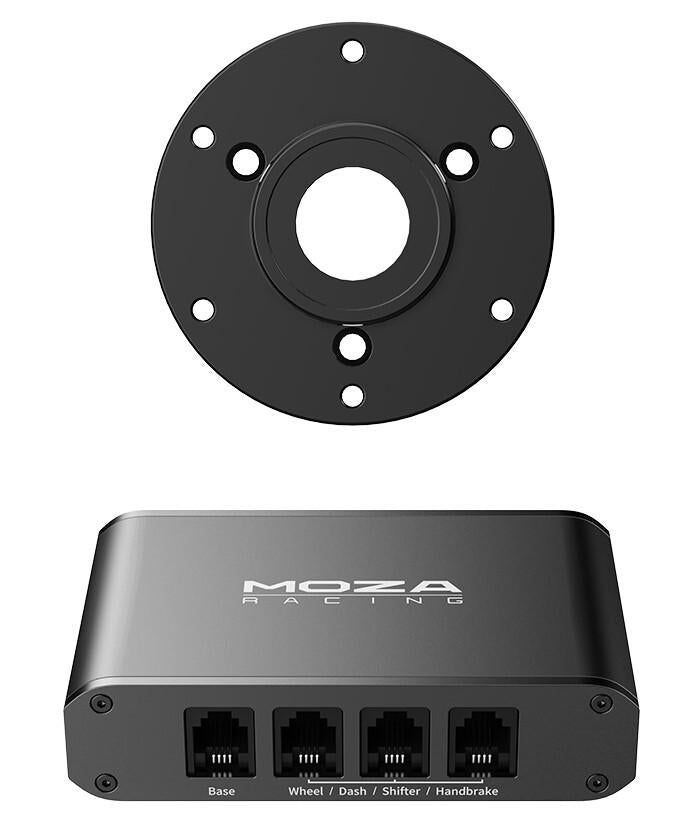 The MOZA Universal Hub Kit provides a versatile and reliable solution for integrating the MOZA steering wheel with various third-party bases, enhancing your simulation experience.Our base adapter is compatible with two main types of mainstream third-party bases, featuring three 50mm bolt patterns and six 70mm bolt patterns. When our adapter is combined with third-party quick releases and mounted onto our steering wheels, it allows for the quick and easy attachment and detachment of our FSR Formula Wheel, KS Steering Wheel, TSW Truck Wheel, Vision GS Wheel.This USB hub allows our FSR Formula Wheel, KS Steering Wheel, TSW Truck Wheel, Vision GS Wheel, SR-P Lite, and future MOZA ecosystem products to connect to a PC, providing power and signal transmission. This hub ensures compatibility with mainstream third-party brand bases, allowing for seamless integration and usage across different platforms.The MOZA Universal Hub features an all-metal design with exceptional rigidity and durability.The dual power supply system ensures the stable operation of power-consuming devices. The dual power supply system is recommended when connecting via USB 2.0.4 Input Ports, including three expansion ports and one pedal port, allow the connection of multiple Moza Racing devices to a single USB port.The adapter has three 50mm and six 70mm threaded hole patterns and can be mounted onto two different third-party wheelbases.The wheelbase adapter is CNC machined with aviation-grade aluminum and high-precision fabrication techniques, ensuring a solid and precise connection and a smooth release process.The wheelbase adapter is quick and easy to install and release.What's included:* Wheelbase Mount Adapter* Extension Hub* Retractable Coil Cord for FSR wheel (3m)* USB Type-B Cable (1.8m)* USB Type-C Cable (1.8m)* 3M AdhesivePlease note:1. The MOZA FSR formula wheel, KS steering wheel, TSW truck wheel, and Vision GS steering wheel need the universal hub and wheelbase adapter to work with wheelbases outside the MOZA ecosystem.2. For wheelbases that require communication with the FSR chip a compatible quick-release adapter is required