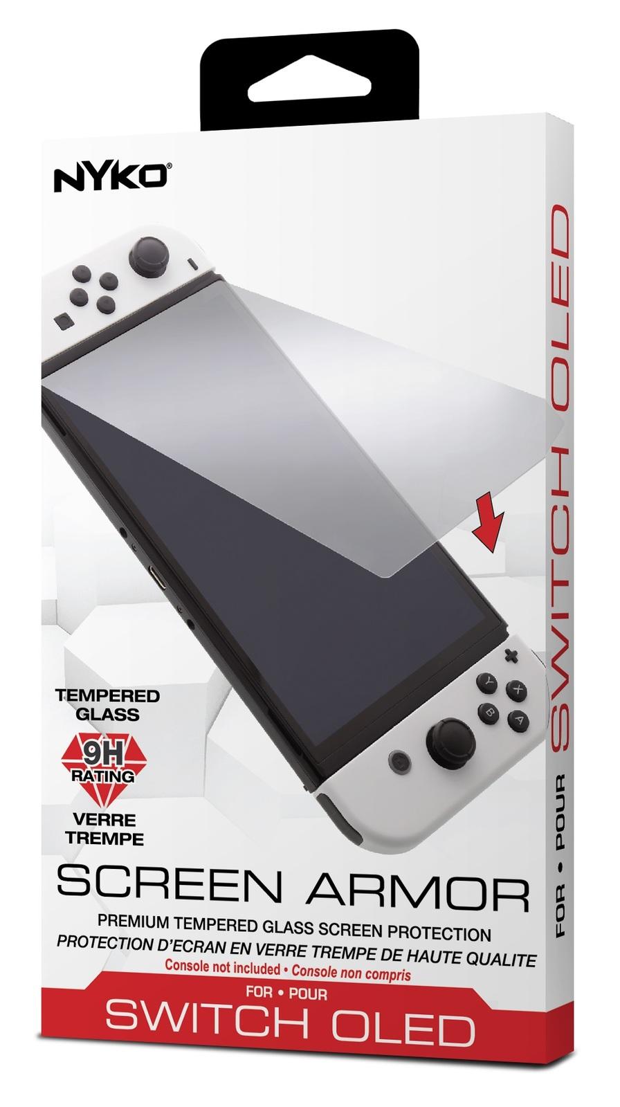 Protect the screen of the Nintendo Switch OLED with Screen Armor from Nyko. Screen Armor protects against scratches, chips, fingerprints and smudges. A 9H hardness rating tempered glass screen protector provides top of the line protection and the rounded edges prevent chipping and snagging. The Oleophobic coating helps guard the screen against everyday wear and tear. Screen Armor is thin enough to be applied and allow the console to be docked to enjoy TV Mode. Included in the package is a set of cleaning wipes to prepare the screen before applying Screen Armor.Features:* 9H Hardness provides top of the line protection against scratches and damage* Oleophobic coating guards against fingerprints and smudges* Rounded edges prevent chipping and snagging\*\*Switch console is not included