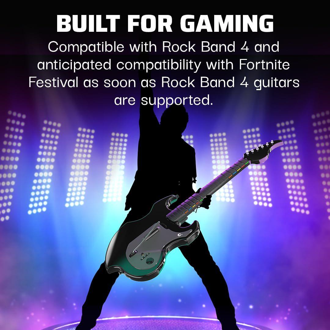 Rock On with the RIFFMASTER wireless guitar controller! The newest guitar in the market allows you to play music like a true rock star now on Fortnite Festival and Rock Band 4. With a unique design that is suitable for both left and right handed guitarists, everybody has a chance to dominate the competition.Enjoy elevated comfort and convenience with a 30-foot low latency wireless connection, a built-in, rechargeable battery for up to 36-hours of play per charge, shoulder strap, and patened pending analog stick. Turn it up to 11 with the 3.5mm audio jack, and adjust volume on-the-fly with the audio controls located on the D-pad. The guitar is also collapsible allowing you to pack it for your next tour or safely store at home. PDP's RIFFMASTER is officially licensed by Xbox and compatible across Xbox Series X|S, Xbox One, and Windows 10/11.Features:* Compatible with Fortnite Festival and Rock Band 4* Officially licensed by Xbox* 30-foot low latency wireless connection with built-in, rechargeable battery for up to 36-hours of play time per charge allows you to play comfortably on the couch* Unique design that is suitable for both left and right handed players* Turn it up to 11 with the 3.5mm audio jack, and adjust volume on-the-fly with the audio controls located on the D-pad* Includes a built-in, patented pending, guitar analog stick, shoulder strap for elevated comfort, and guitar is collapsible for easy storage