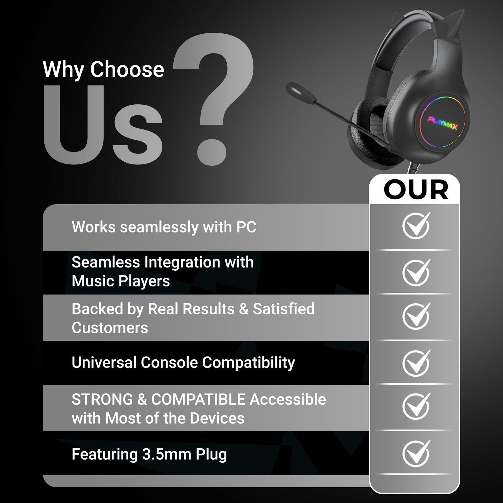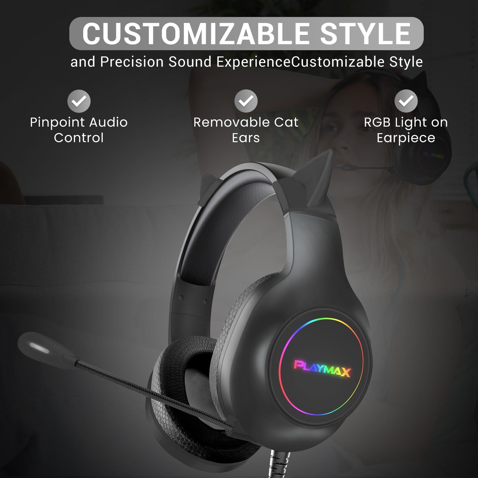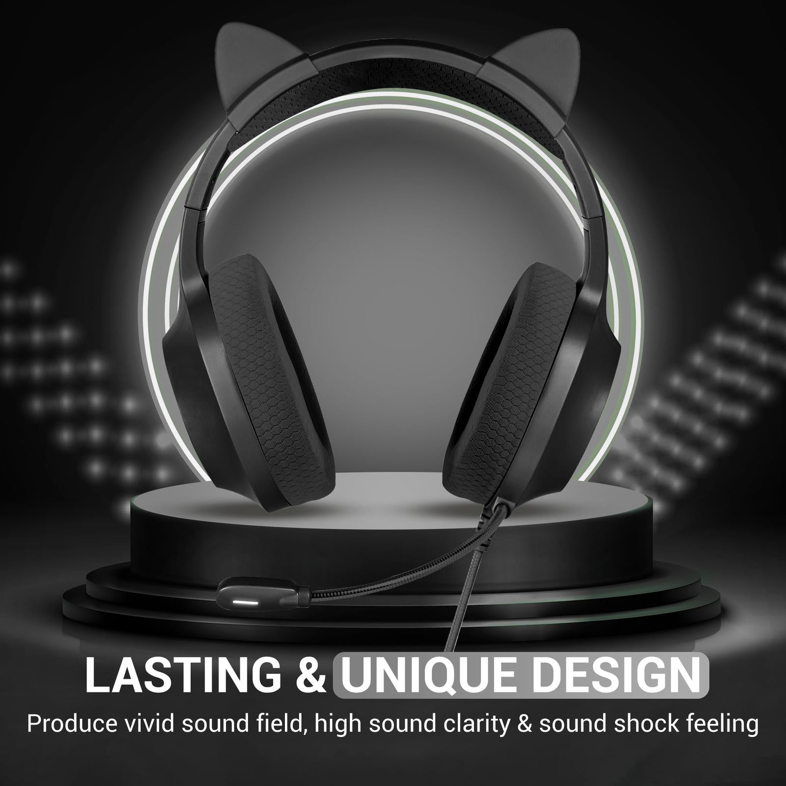 *COMFORTABLE AND BREATHABLE EARMUFFS*Built with long-lasting soft fabric, the replaceable earmuffs ensure extended comfort and resilience—perfect for marathon gaming sessions*50mm LARGE CALIBRE SPEAKERS*Shocking sound gives you a sense of reality. Build-in 50mm high fidelity speakers, which produce rich sound quality, a vivid sound field, high sound clarity and a sound shock feeling. High standard of hardware configuration, providing an excellent gaming and immersive video experience*VOLUME CONTROL & MICROPHONE MUTE*High-precision smooth scroll wheel control headset volume mute, which allows you to control the volume freely.*REMOVEABLE CAT EARS*Using Silicone material, safe, odourless, durable, and non-deformable.*RGB LIGHT ON EARPIECE*The colourful RGB lighting effects greatly highlight the marvelous game atmosphere and provides a cooler gaming experience. It allows the gamer to be more immersed in the game atmosphere as the lighting colour changes.*STRONG COMPATIBILITY*With 3.5 MM plug, microphone and headset which can be compatible with Xbox one, Xbox Series X, Nintendo Switch 1 and 2, PlayStation 4 and 5, computer, laptop etc. The included 3.5mm headphone splitter further extends the compatibility!Specifications:CABLE LENGTH: 2.2mDRIVER DIAMETER: 50mmFREQUENCY RESPONSE: 20hz-20khzMIC SENSITIVITY: –42dB±3dBPLUG TYPE: .3.5mm+USB