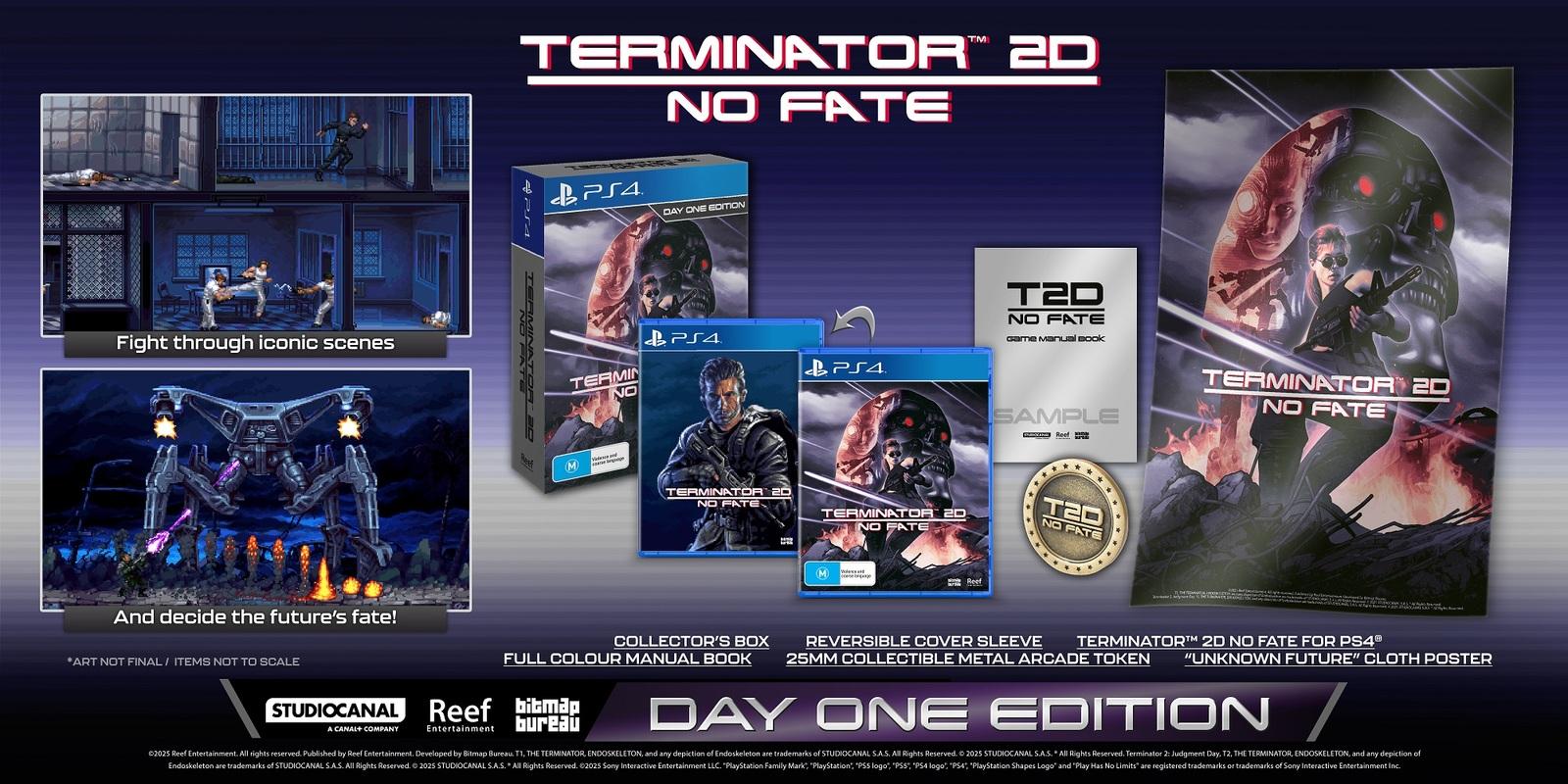 Terminator 2D: NO FATE Day One Edition includes:* Terminator 2D: NO FATE game* Reversible Cover Sleeve* “Unknown Future” Cloth Poster* 25mm Collectible Metal Arcade Token* Full Colour Manual Book* Collector‘s BoxExperience the events of ‘Terminator 2: Judgment Day’ brought to life through glorious pixel artwork and action-packed arcade gameplay! Play as Sarah Connor and the T-800 through a variety of thrilling missions as they take on the T-1000 and try to put a stop to Skynet’s plans before the human race is annihilated. Lead the Resistance as John Connor in the future, fighting on the front lines as mankind’s only hope in the War Against the Machines. In this unique story blending iconic scenes from ‘Terminator 2: Judgment Day’ with original scenarios and multiple endings, humanity’s fate is yours to decide.Features:* Step into a classic arcade experience that pays homage to the Terminator universe with authentic arcade gameplay, music and visuals built from the ground up.* Relive iconic moments and forge new paths as Sarah, John and the T-800 in a narrative featuring a mix of classic Terminator 2: Judgment Day scenes and untold Terminator stories.* Shoot, sneak and escape the T-1000’s blades in a wide array of levels, and lead the Resistance as John Connor in critical Future War missions.* Battle against the full force of Cyberdyne and Skynet’s arsenal, with multiple enemy types and adrenaline-pumping boss fights to take on.* See the world of Terminator 2: Judgment Day like never before with detailed 2D sprite artwork of your favourite characters and scenes.* Enjoy a cinematic soundtrack featuring recrafted music from the legendary Terminator 2: Judgment Day score and all-new compositions.* Aim for the highest rank in each level to reign supreme on your high score table and achieve arcade immortality.* Mix things up with multiple different game modes to choose from: Story Mode, Arcade Mode, Infinite Mode, Boss Rush, Mother of the Future and Level Training!* Voiceover Option: English* Text language: English, French, Italian, German, Spanish (Spain), Portuguese (Brazil), Russian, Polish, Japanese, Korean, Simplified Chinese, Traditional Chinese