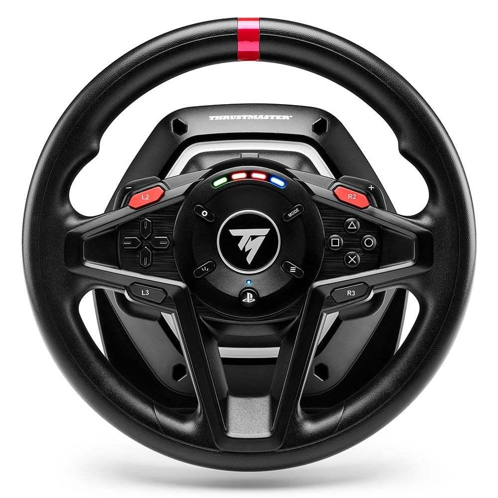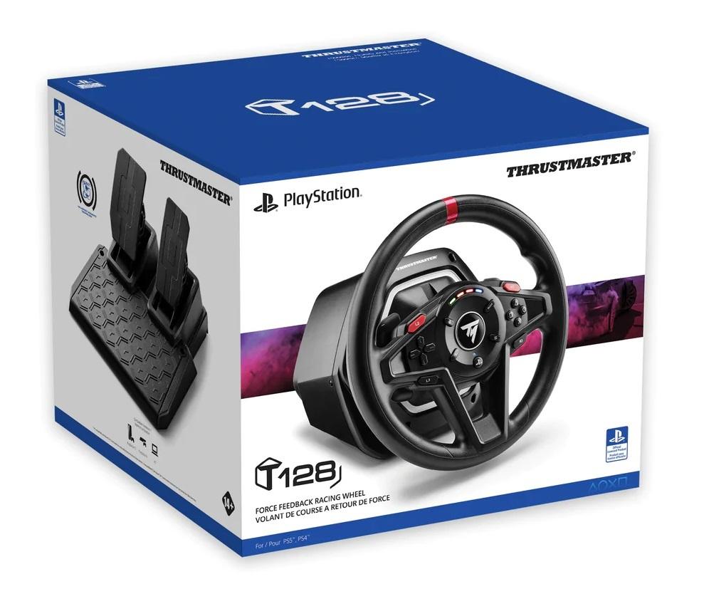 T128 features the HYBRID DRIVE system, which combines a belt and gears mechanism to provide immersive and versatile force feedback, and delivers 20% more power than other Thrustmaster TMX hybrid racing wheels .Its lightweight wheel helps you really feel the sensations transmitted by the force feedback system, for an authentic racing experience and to optimize your racing lines. A 4-color LED strip lets you keep an eye on the engine speed level and indicates when it is time to change gear. Thanks to the clamping system, the racing wheel can be adjusted to fit desks and tables for quick and easy setup. The T2PM pedal set included with the racing wheel features patented frictionless magnetic technology, for enhanced precision that won’t decrease over time.T128 has been designed for all gamers looking for a first racing wheel offering a new immersive experience, and users who want to improve their driving skills. T128 is an officially licenced wheel for PlayStation 4 and PlayStation 5, and is compatible with PC.Feel the road through the racing wheel with the HYBRID DRIVE force feedback, enjoy a fully immersive experience and build up your racing skills. Optimize your racing lines, control your drifts and outmanoeuver your rivals thanks to the T128 and its T2PM pedal set featuring a reliable and ultra-precise magnetic technology.*IMMERSIVE FORCE FEEDBACK*The HYBRID DRIVE technology in the force feedback system means the player experiences all the fun and the intuitive feel of driving. The weight of each vehicle, bumps and impacts from the road, loss of tire grip in the corners and road surface types can be felt through the racing wheel, for immersive racing and to awaken your driver instinct.*MAGNETIC PADDLE SHIFTERS*Thanks to H.E.A.R.T magnetic technology, the paddle shifters have a super-fast gear change time (30 ms response time) with clear and precise activation for sports driving while preventing steering errors.This patented technology, delivered by a contactless, frictionless magnetic system, offers unprecedented longevity over the long term.*ENGINE SPEED LEDS*The 4-color LED strip means you can keep an eye on the engine speed without taking your eyes off the road. The LEDs flash when you need to shift into a higher gear, so you can fully optimize your gear changes. The list of compatible games on PlayStation and PC is updated regularly on the Thrustmaster technical support website."*SLEEK AND VERSATILE DESIGN*The round, lightweight wheel takes full advantage of the capabilities of force feedback for maximum velocity. Its 270° to 900° angle of rotation automatically adjusts based on the vehicle that you drive in the game and adapts to all styles of vehicles (GT, rally, F1, trucks). The 13 action buttons on the racing wheel mean you can do away with the gamepad.*MOUNTING SYSTEM FOR DESKS AND TABLES*The included clamping system is easy to mount and you don’t need any tools to quickly set up your racing wheel before gaming sessions, and store it afterwards if needed. The clamp fits tables and desks up to 5.5 cm thick.*MAGNETIC PEDAL SET*The included T2PM magnetic pedal set offers unprecedented precision to within a thousandth of a second for crisp acceleration and gauged braking.The T2PM pedal set delivers a completely smooth experience without any risk of losing precision like more traditional pedal sets equipped with potentiometers, making it a powerful and reliable aid for improving your driving skills.*ON-WHEEL HANDBRAKE*The front of the racing wheel includes two handbrake buttons that can be easily accessed with your thumbs for crazy drifts and freestyle manoeuvers. The button layout is symmetrical for ambidextrous use and more control, whatever the direction of your manoeuver.Features:* Immersive force feedback to really feel the sensation of racing: speed, surfaces, bumps and impacts, loss of tire grip* Engine speed LEDs to optimize gear changes* Modern design and rotation angle up to 900° suited to all styles of vehicles and games* Magnetic paddle shifters (patented H.E.A.R.T technology) for instant responsiveness, and a clear gear shifting feel* Handbrake buttons accessible from the racing wheel, for better skid control* Quick mount system suitable for desks and tables up to 5.5 cm thick* Magnetic 2-pedal pedal set (patented H.E.A.R.T technology) featuring 12-bit precision that won’t decrease over time* Next-generation HYBRID DRIVE technology delivering 20% more power than the other Thrustmaster hybrid racing wheels (TMX series)* Officially licenced for PlayStation and compatible with PlayStation 5, PlayStation 4 and PC (Windows 10/11)