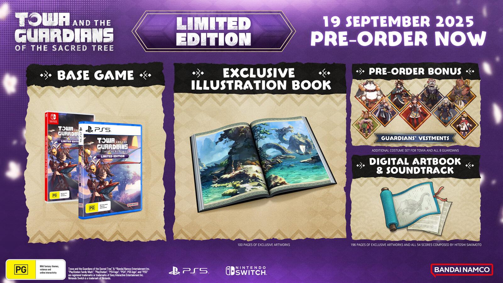 Towa and the Guardians of the Sacred Tree Limited Edition includes:* Towa and the Guardians of the Sacred Tree base game* Exclusive Illustration Book* Digital artbook & soundtrackIn this Roguelite-RPG adventure set in a far-off mystic realm, ancient forces stir, and untold dangers await. As Towa, lead the guardians of the sacred tree in forging strong relationships and powerful swords to fight Magatsu’s forces and determine the future of Shinju Village.Features:* ENTER A VIBRANT WORLD FILLED WITH BEAUTY AND PERILOUS DANGER – On your quest to restore peace, play as Towa and the Guardians as they explore far-off lands threatened by Magatsu’s evil influence. In a world where even splendor hides a lurking threat, courage is the only way forward. As Hitoshi Sakimoto’s melodies guide the way, a breathtaking yet untamed landscape unfolds where the fight to save Shinju Village begins.* FIGHT AS A DUO IN A THRILLING ROGUELITE COMBAT – Towa, priestess of Shinju, stands united with 8 trustworthy companions to defeat Magatsu. Fight alongside a fellow guardian and wield the power of the sacred sword (Tsurugi) and staff (Kagura). Each guardian has its own abilities and sets of swords, making each combat style and guardian pair unique. Together, pave your way through colorful lands, conquer dungeons, and defeat Magatsu’s minions!* FORGE SWORDS AND BONDS THAT STAND THE TEST OF TIME – As the guardians pursue their quests across different timelines, the village evolved over the years. Develop unique bonds with its residents and learn more about their customs and stories that are woven into the inner workings of the village. Each visit is a chance to train at the dojo, summon powerful Graces, and craft new swords at the smithing shop.